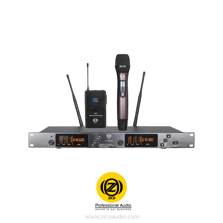 میکروفن بیسیم زیکو U-800HC از دیگر محصولات با کیفیت برند زیکو میباشد. خروجی صدای عالی این محصول آن را از دیگر رقبا متمایز کرده است. برند زیکو ساخت کشور کره جنوبی و تحت لیسانس آلمان میباشد. در سالهای اخیر این برند از محبوبیت خاصی برخوردار شده است. این میکروفن، از نوع بیسیم دو کاناله است که مجهز به یک میکروفن دستی و یک میکروفن یقه ای عالی میباشد. این محصول پرطرفدار، سیگنالهای قوی و با عملکرد بسیار بالا و بدون افت کیفیت صدا ایجاد میکند. برد میکروفن بالای ۲۰۰ متر است. بنابراین، این میکروفن قابل استفاده در مراسمات مذهبی، جشنها، سخنرانیها، خوانندگی و … در مساحتهای بزرگ میباشد. الگوی قطبی آن از نوع unidirectional است یعنی از یک جهت اصوات را دریافت میکند. بنابراین، صداهای اطراف و پشت میکروفن حذف میشود.